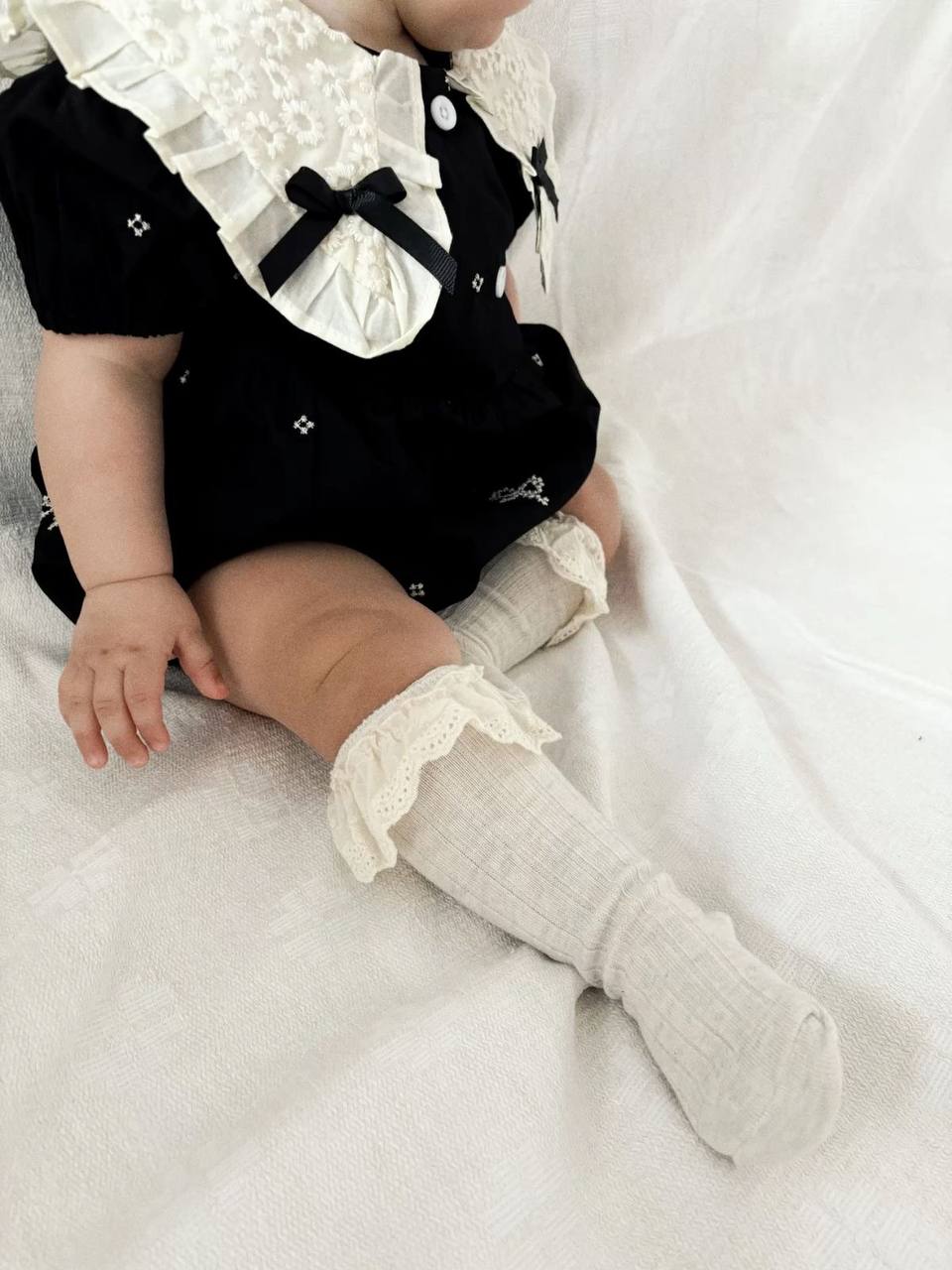 Еластична в’язка добре тримається на ніжці, не здавлює її та не сповзає під час рухів малюка. А витончена мереживна оборка додає шкарпеткам ніжного та святкового вигляду, тому вони чудово підходять як для щоденного носіння, так і для фотосесій чи особливих подій.