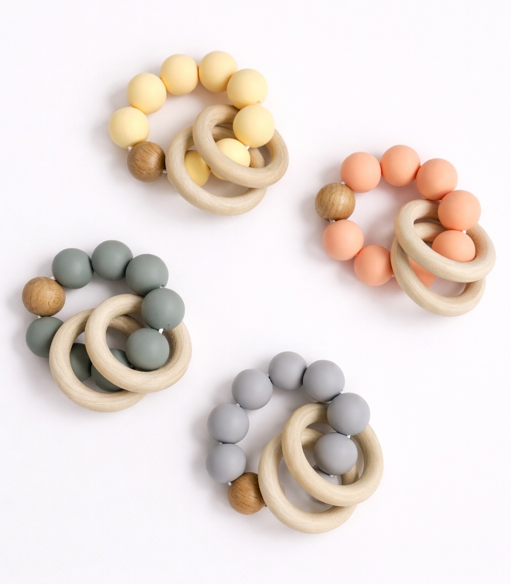 Прорізувач-браслет поєднує безпечні силіконові намистини та натуральні дерев’яні кільця, що робить його чудовим аксесуаром для малюка під час прорізування зубів. М’який харчовий силікон ніжно масажує ясна, допомагаючи зменшити дискомфорт.
