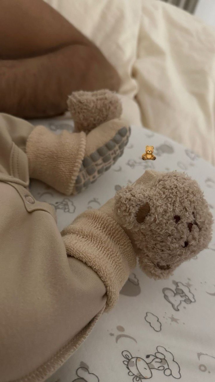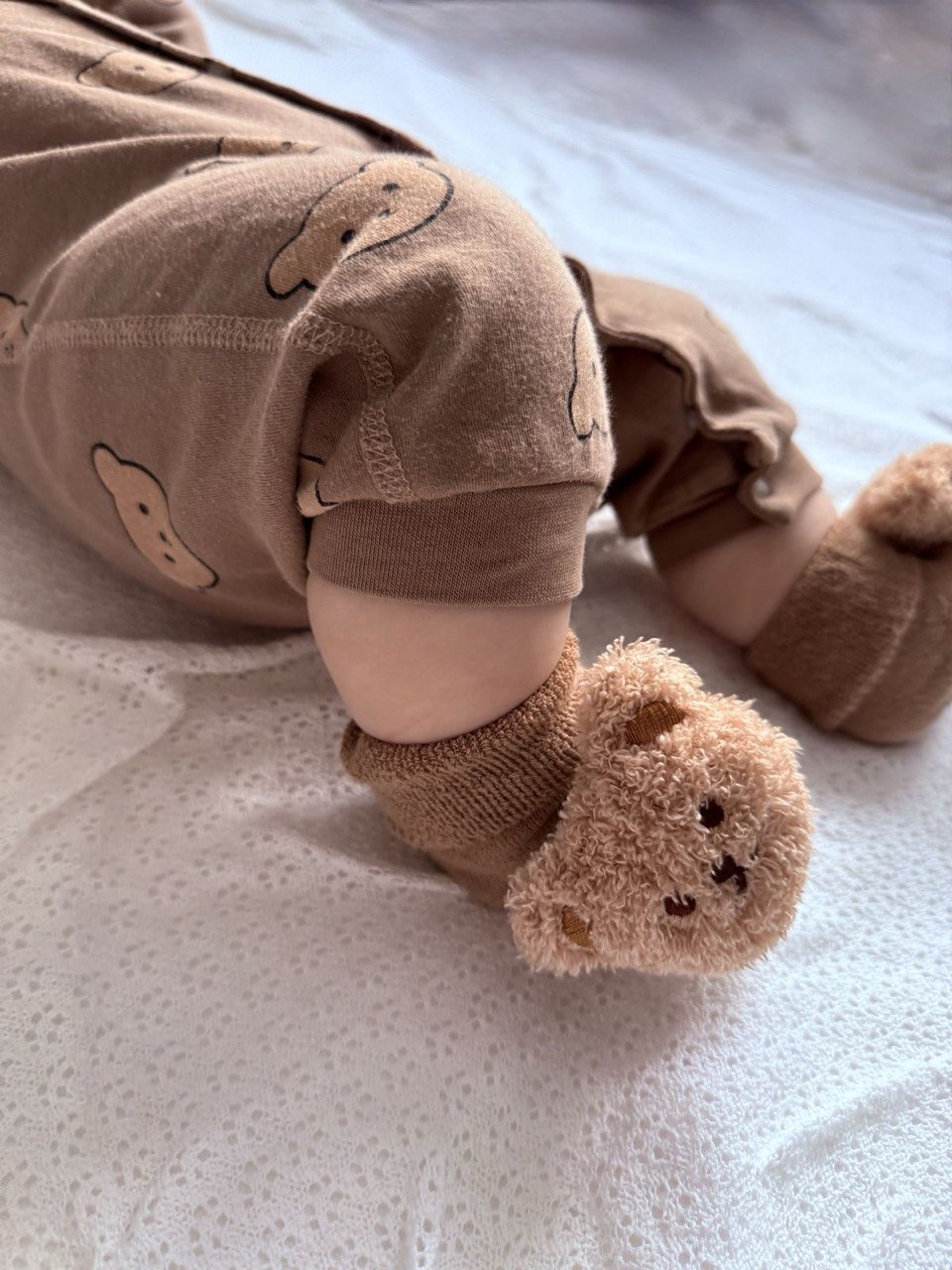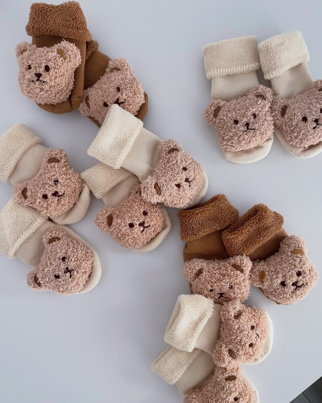 Шкарпетки ніжні до шкіри, добре пропускають повітря та мають еластичну резинку, яка надійно тримається на ніжці, не здавлюючи її. Декоративний ведмедик робить їх особливо милими та стильними, тому вони чудово підходять як для щоденного носіння, так і для прогулянок або фотосесій.