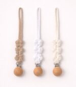 Ніжний тримач для пустушки ручної роботи, виконаний у мінімалістичному стилі. Він допомагає надійно закріпити пустушку до одягу малюка, щоб вона не падала на підлогу і не губилась під час прогулянок чи подорожей.